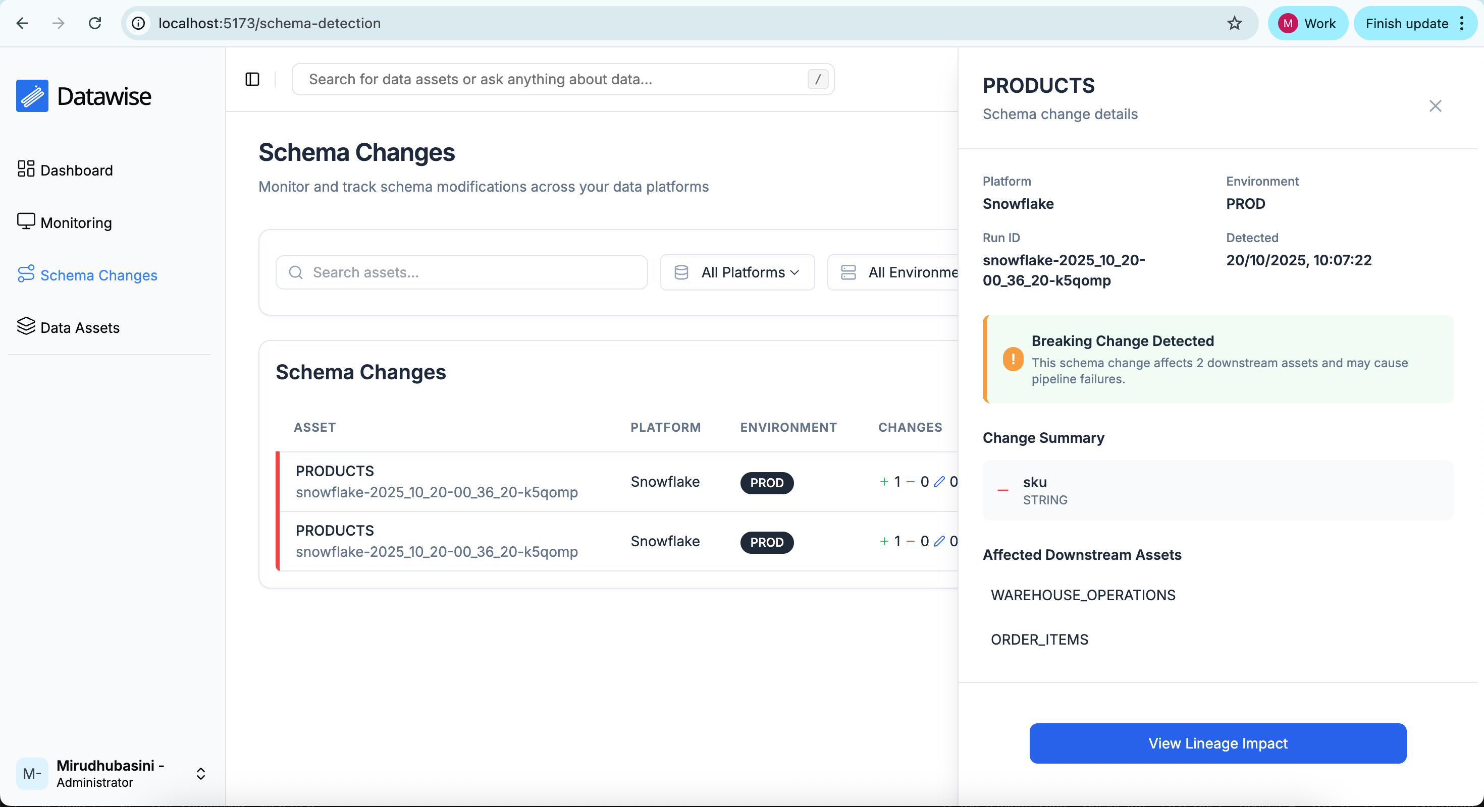 When a schema changes, Datawise now pinpoints what broke, why, and which downstream assets are affected. No more guesswork.